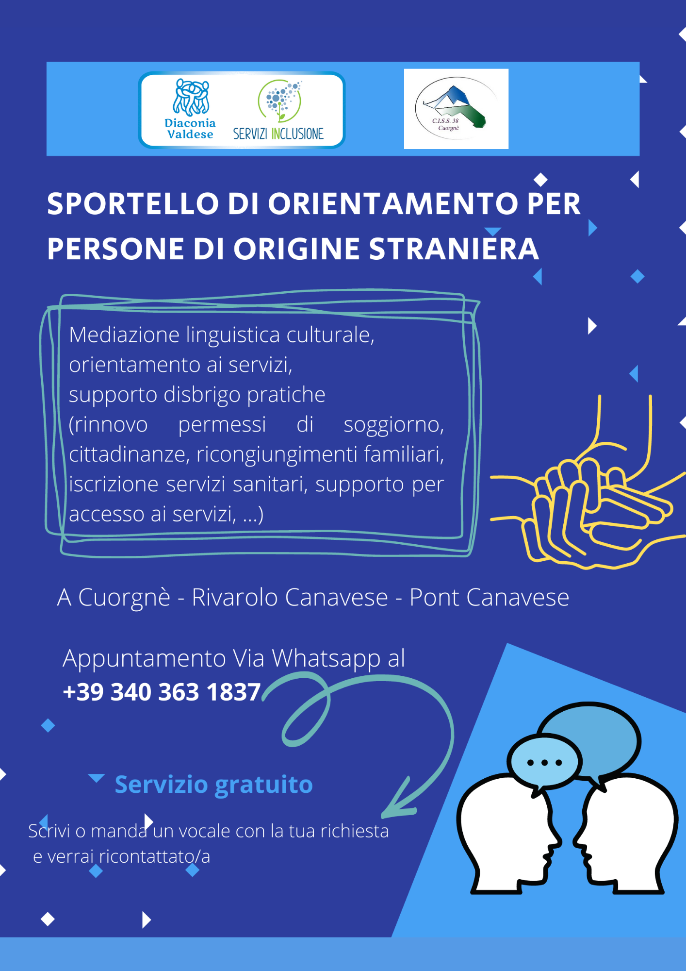 Lo sportello offre un servizio gratuito di supporto nel disbrigo di pratiche (es. supporto nella compilazione di moduli, richieste), orientamento ai servizi, consulenza per tutto ciò che attiene i titoli di soggiorno.