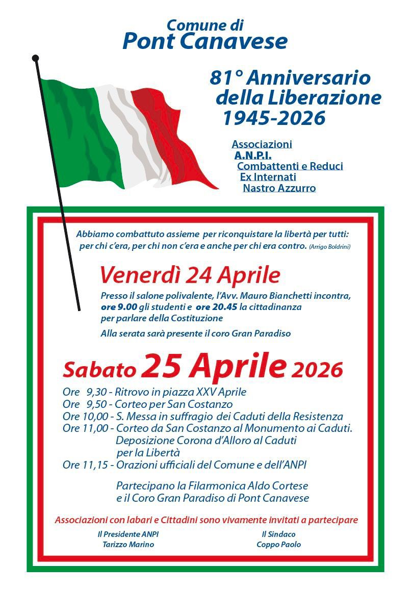 Il Comune di Pont Canavese invita tutta la cittadinanza a partecipare alle celebrazioni in programma il 24 e il 25 aprile 2026: due giornate dedicate alla memoria, ai valori della libertà e alla nostra Costituzione.