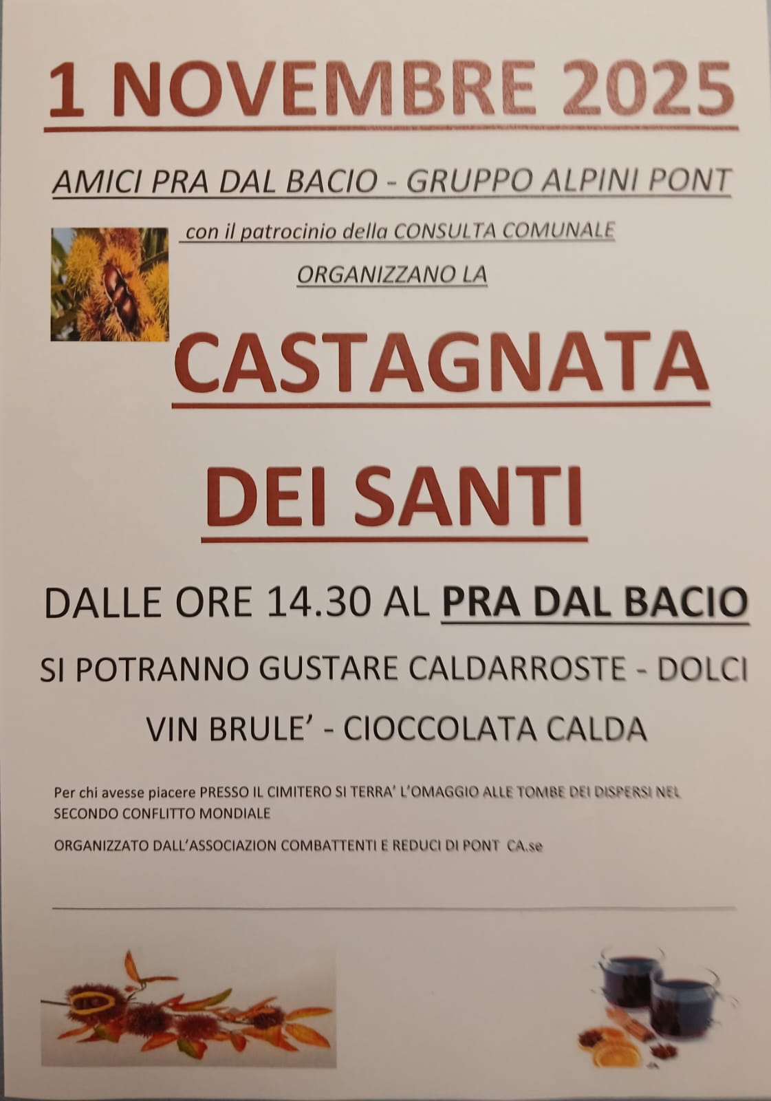 Amici Pra' del Bacio e Gruppo Alpini di Pont, organizzano l'attesa "Castagnata dei Santi".