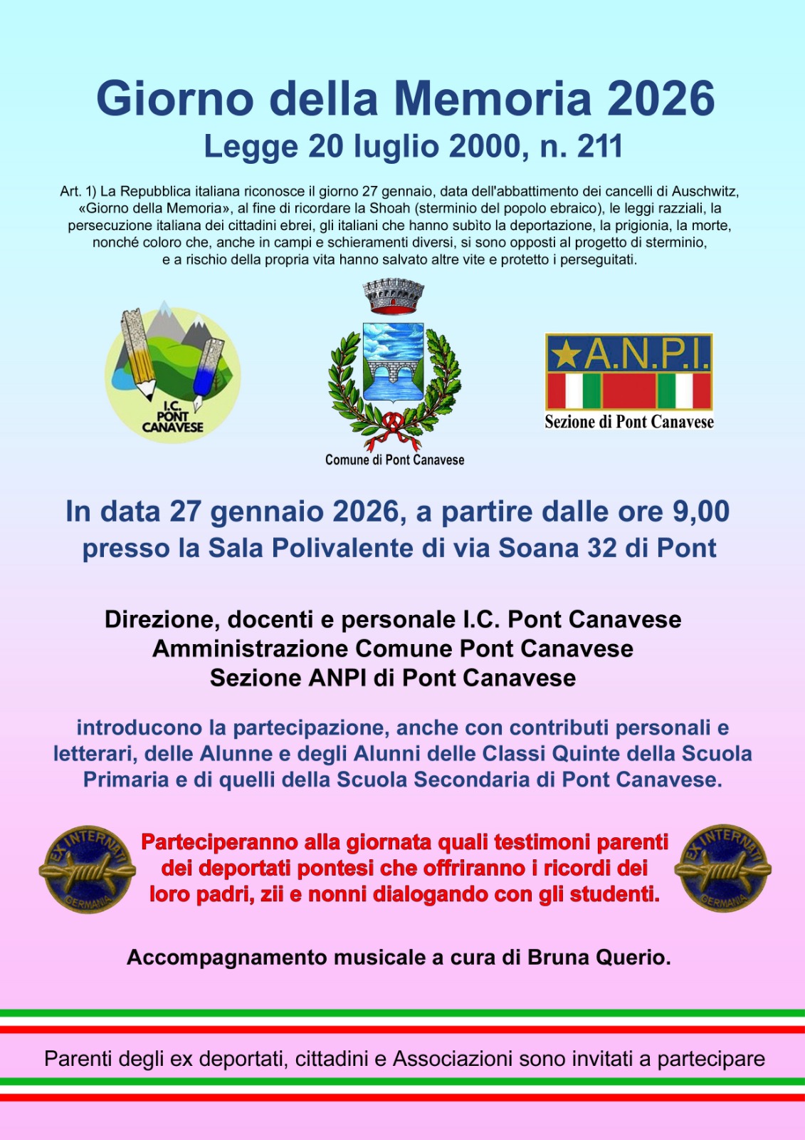 Il 27 gennaio 2026, in occasione del Giorno della Memoria, la comunità di Pont Canavese si riunisce per ricordare la Shoah, le leggi razziali, la persecuzione e la deportazione, rendendo omaggio a tutte le vittime e a coloro che, mettendo a rischio la propria vita, seppero opporsi all’orrore e salvare altri esseri umani.