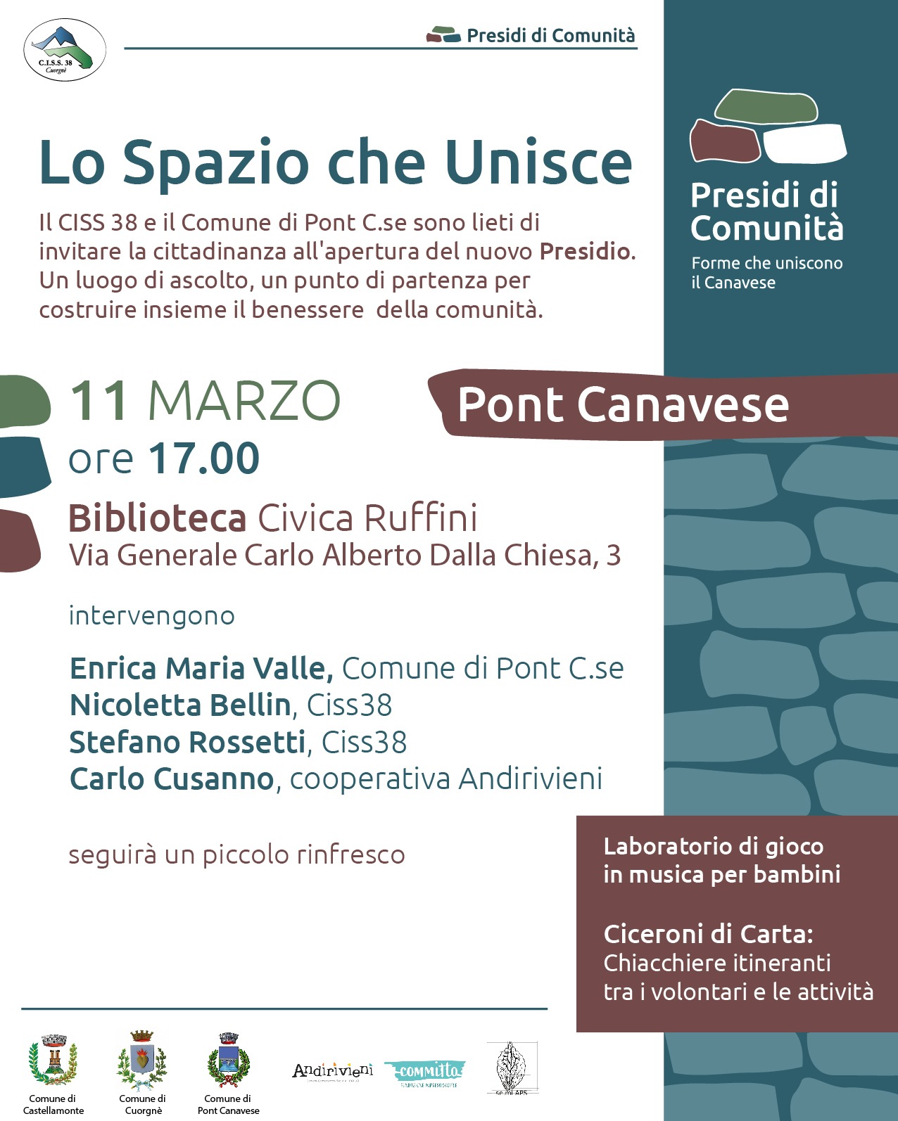Il CISS 38 e il Comune di Pont Canavese sono lieti di invitare la cittadinanza all'inaugurazione del nuovo Presidio di Comunità, spazio di aggregazione e confronto pensato per promuovere il benessere collettivo e favorire la partecipazione attiva della cittadinanza.