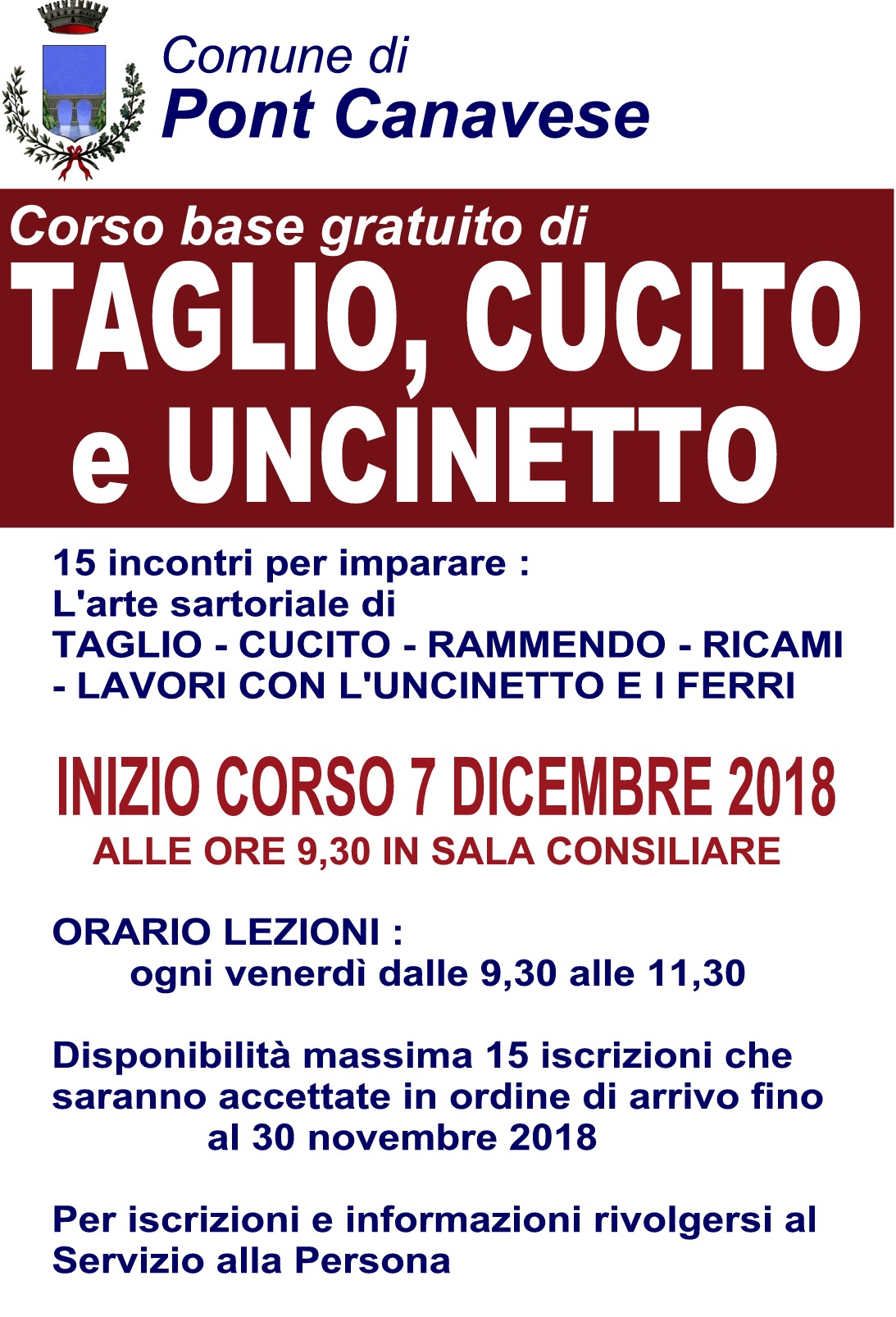 Iscrizioni presso il servizio alla persona fino al 30 novembre 2018.