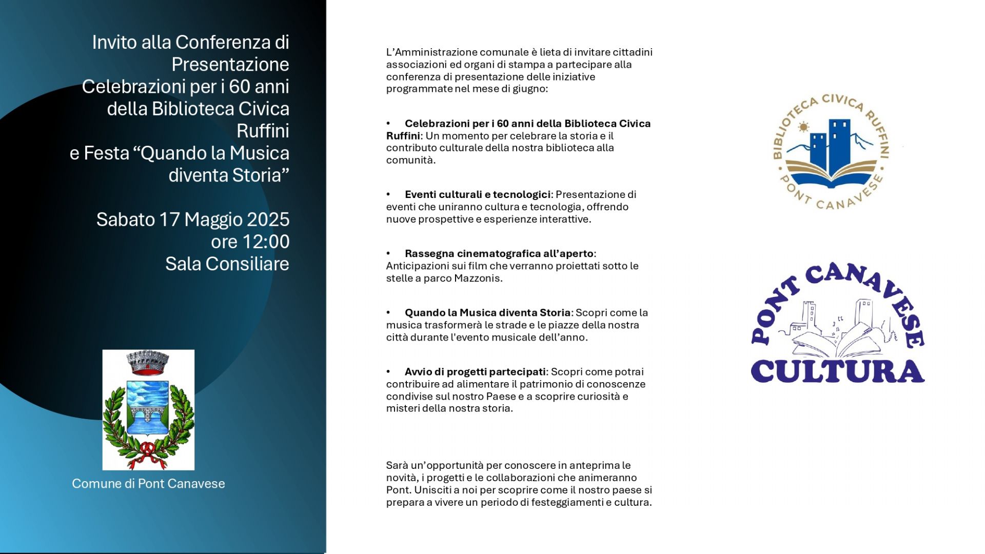 Sarà un'opportunità per conoscere in anteprima le novità, i progetti e le collaborazioni che animeranno Pont. Unisciti a noi per scoprire come il nostro paese si prepara a vivere un periodo di festeggiamenti e cultura.