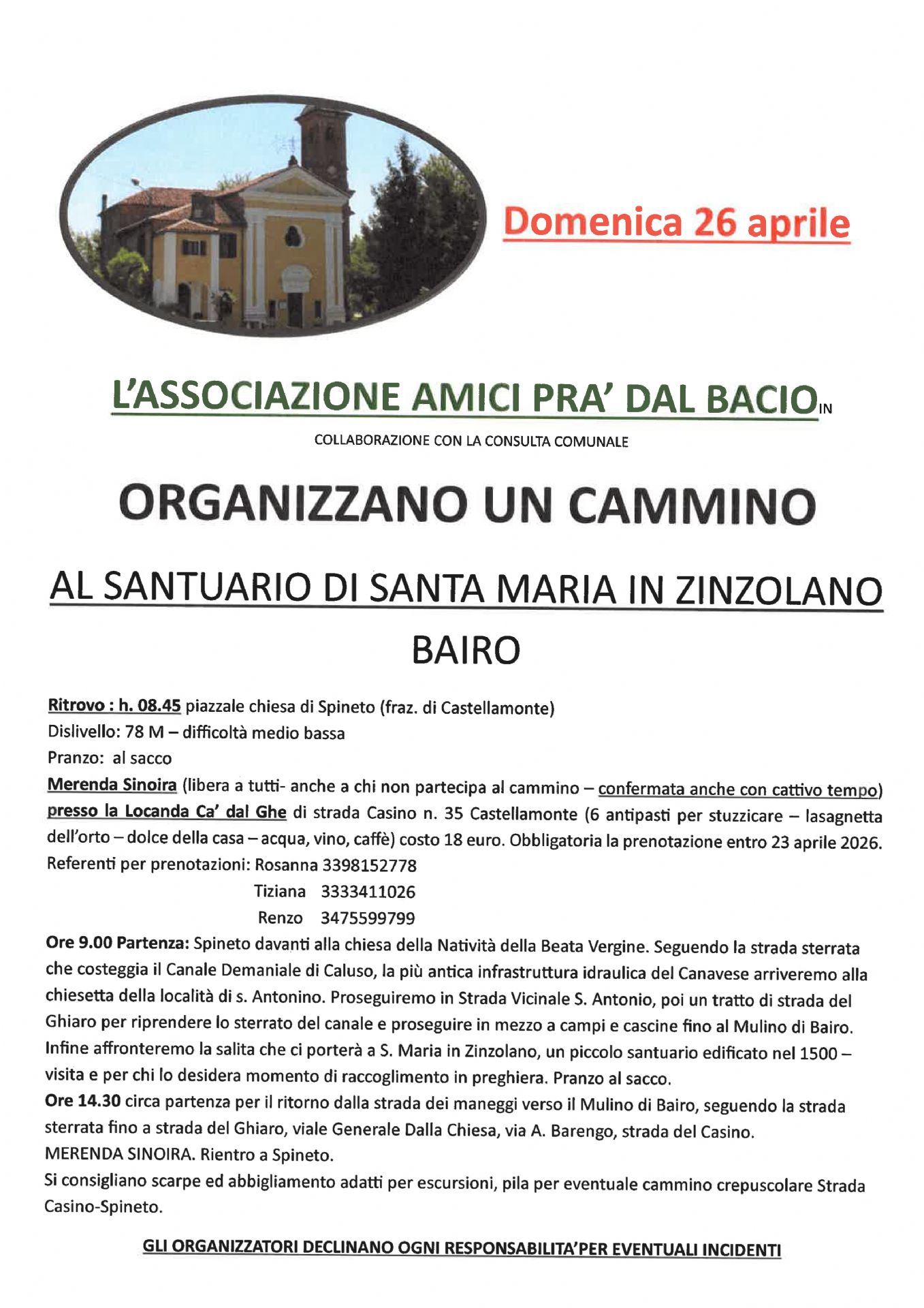 L'associazione Amici Pra' del Bacio in collaborazione con la Consulta Comunale organizzano un cammino presso il Santuario di Santa Maria in Zinzolano (Bairo)