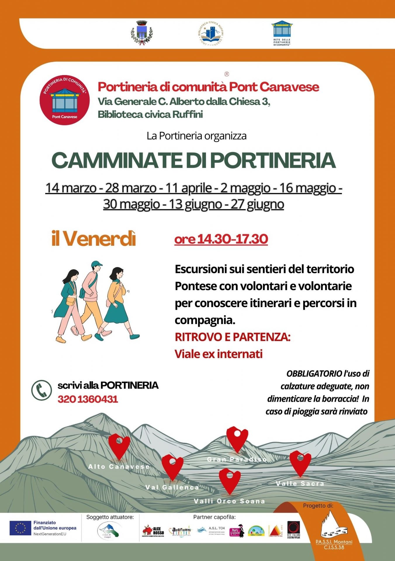 La Portineria di Comunità di Pont Canavese organizza le "Camminate di Portineria", escursioni sui sentieri del territorio Pontese, con volontari e volontarie, per conoscere itinerari e percorsi in compagnia.