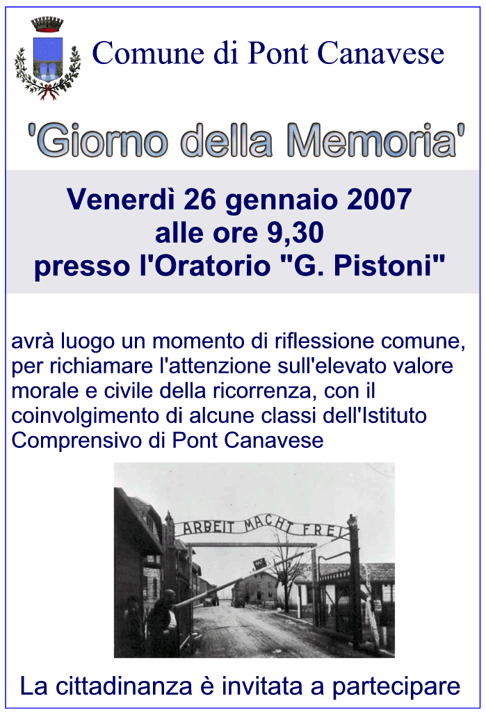 Presso l'Oratorio "G.Pistoni" alle ore 9,30 avrà luogo un momento di riflessione comune, per richiamare l'attenzione sull'elevato valore morale e civile della ricorrenza, con il coinvolgimento di alcune classi dell'Istituto Comprensivo di Pont Canavese