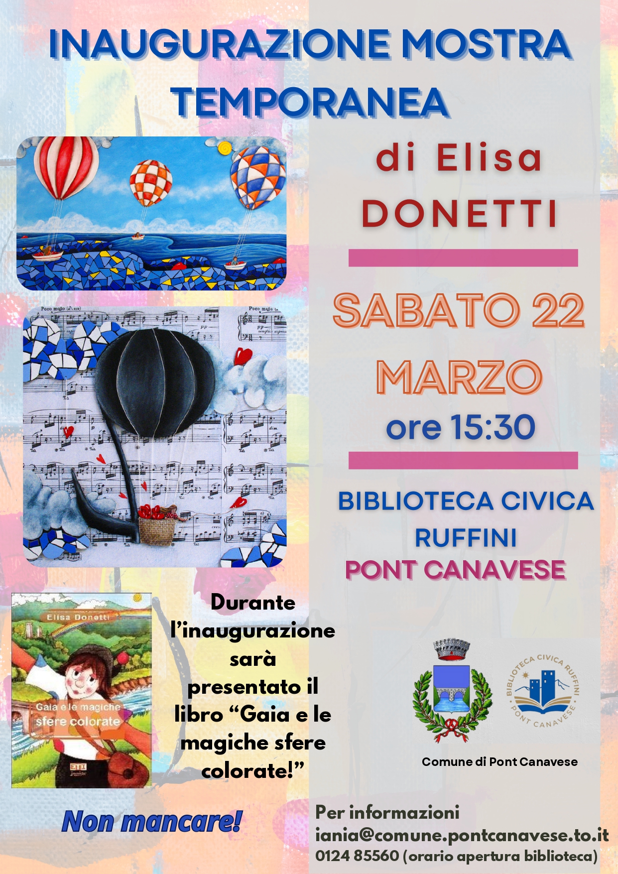 Sabato 22 marzo alle ore 15.30 nella Biblioteca di Pont Canavese sarà inaugurata la mostra d'arte temporanea dell'artista pontese Elisa Donetti e sarà presentato il libro "Gaia e le magiche sfere colorate!" scritto e illustrato dalla stessa autrice.