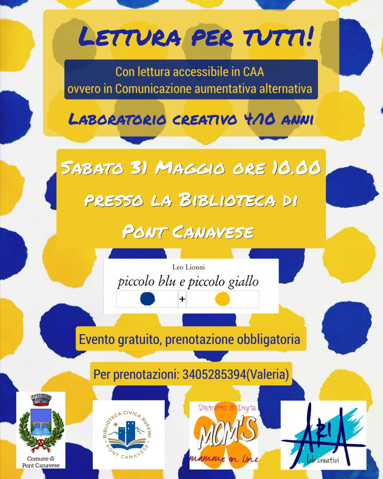 Laboratorio di lettura in CAA (Comunicazione Aumentativa Alternativa) per bambini dai 4 ai 10 anni, sabato 31 maggio 2025 ore 10:00, presso la Biblioteca di Pont Canavese.