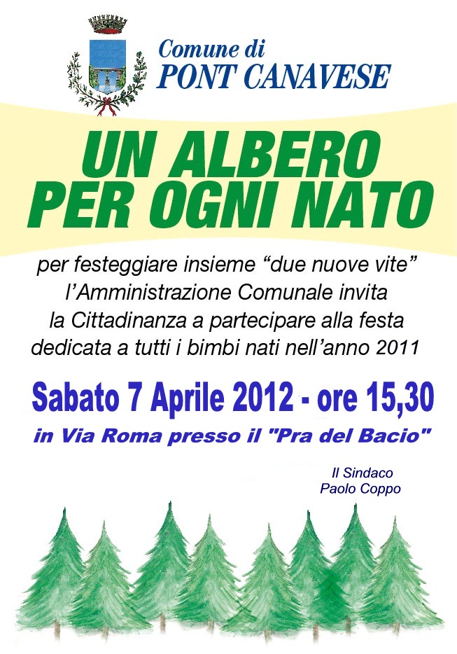 in Via Roma presso il "Pra del Bacio" , alle ore 15,30, verranno messi a dimora alcuni alberelli che saranno contrassegnati con il nominativo dei bambini nati nel 2011. Sarà un giorno molto importante in quanto si festeggeranno insieme ai genitori “due nuove vite”.